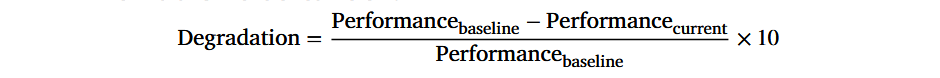 Accuracy指标使用MetaQA数据集评估了每个模型变体的性能。表7展示了所有训练数据规模的综合结果。性能下降的计算公式如下:
