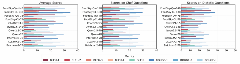 实验结果:在FoodLongConv基准测试中,FoodSky-Qw-7B表现优异,生成了高质量且符合上下文的长文本回答;在FoodQA基准测试中,FoodSky-Qw-14B生成了流畅、逻辑性强且专业的回答,表现远超其他模型。