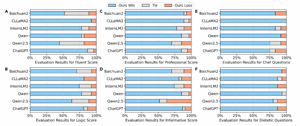 从以上实验结果来看,FoodSky模型在食品领域的应用展示了强大的能力,特别是在面对食品相关考试、食谱推荐、健康饮食建议等任务时,有着出色的表现。
