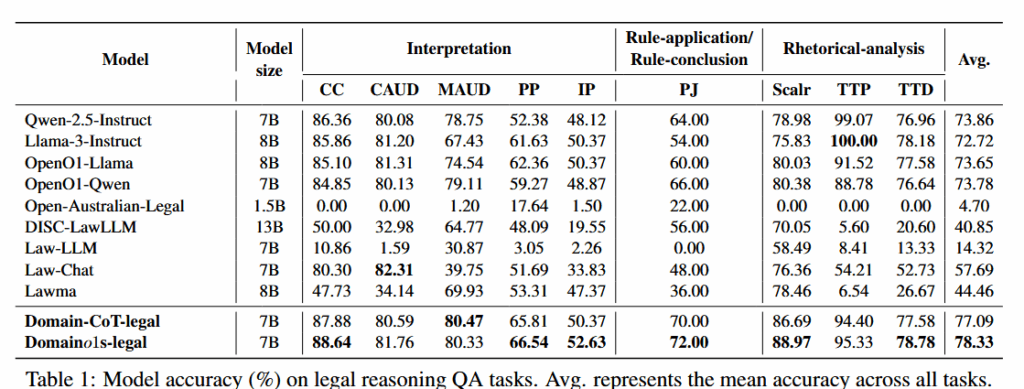 (1)法律 QA:Domaino1s-legal(7B)在多个子任务上达到更高平均准确率(Avg≈78.33),优于 Domain-CoT-legal(Avg≈77.09)和多种法律模型。